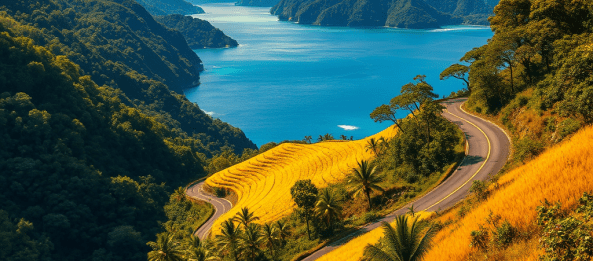 Setelah melewati kawasan hutan primer, kita disajikan dengan pemandangan pegunungan yang hamparan gunungnya terlihat perkasa dan berlapis-lapis. Di lembah-lembah dan dataran tinggi, pertanian menjadi pemandangan utama. Di sinilah keajaiban kontras tercipta. Di lereng gunung yang landai, padi menguning terhampar luas seperti permadani emas. Hamparan sawah yang siap panen ini memberikan palet warna kuning keemasan yang cerah, kontras dengan latar belakang gunung yang biru keunguan di kejauhan. Pemandangan ini adalah lukisan lanskap yang sesungguhnya—sawah yang tertata rapi, berbingkai pegunungan yang kokoh.